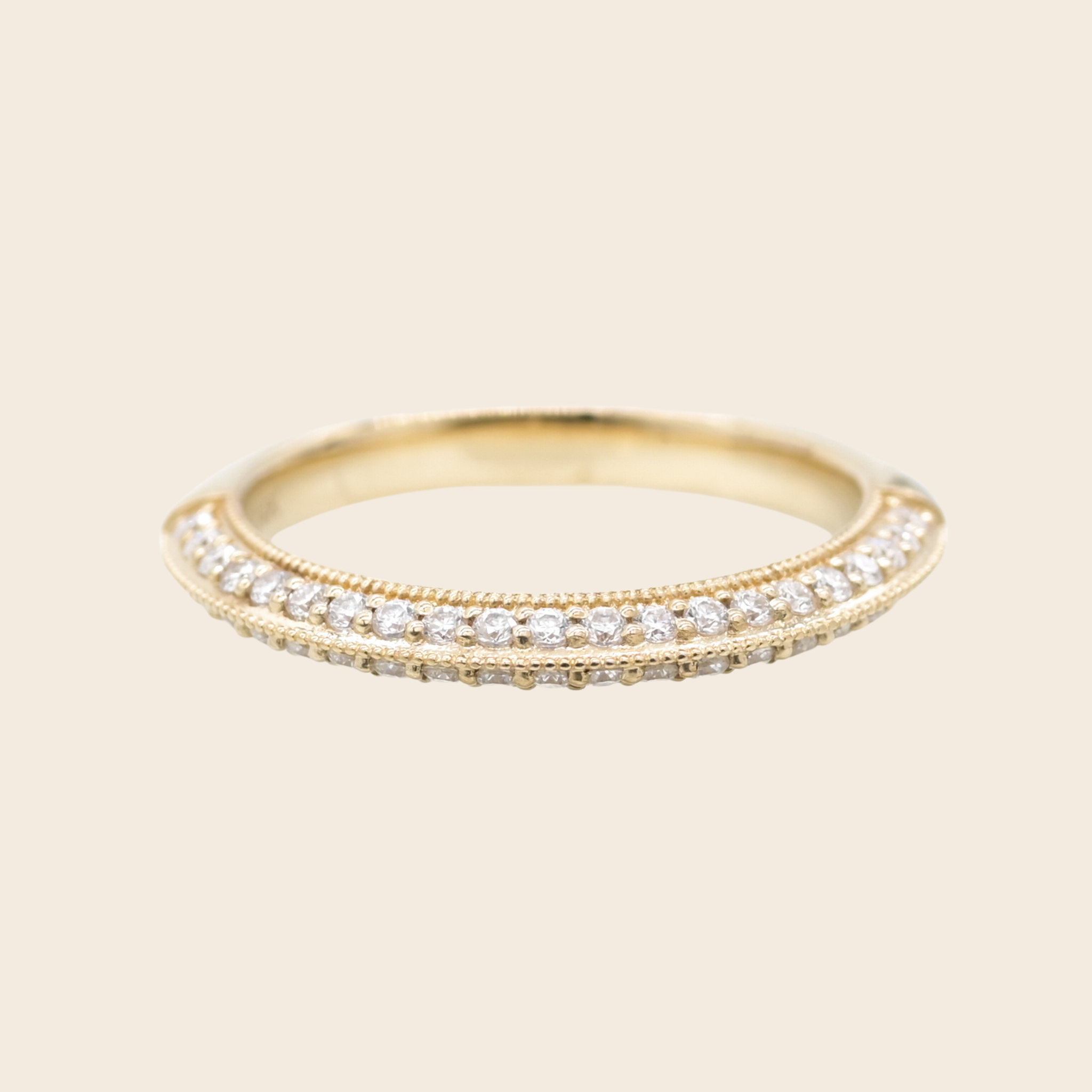 The Margot Knife Edge Band is classic but cool. With sharp lines, pave stones and milgrain detailing, she's beautiful from every angle.