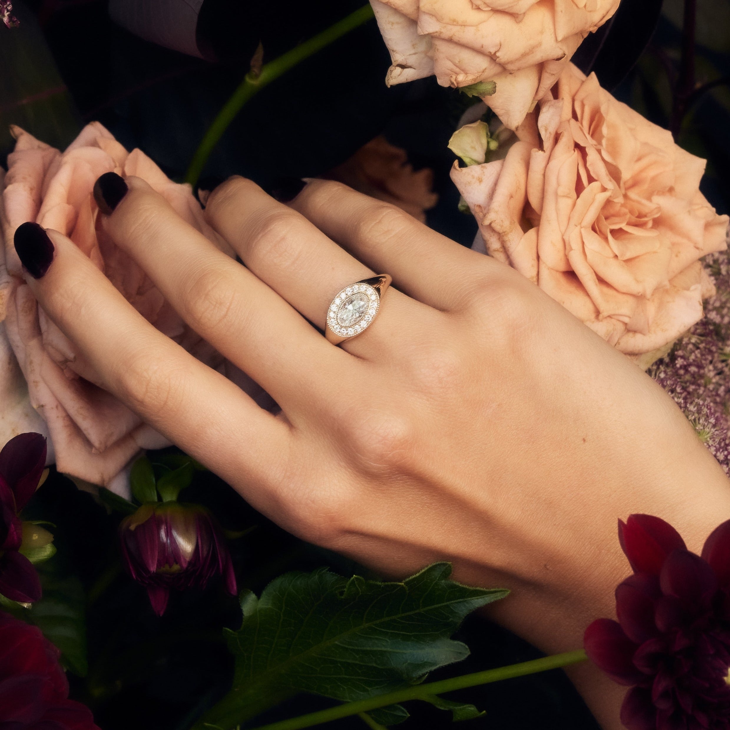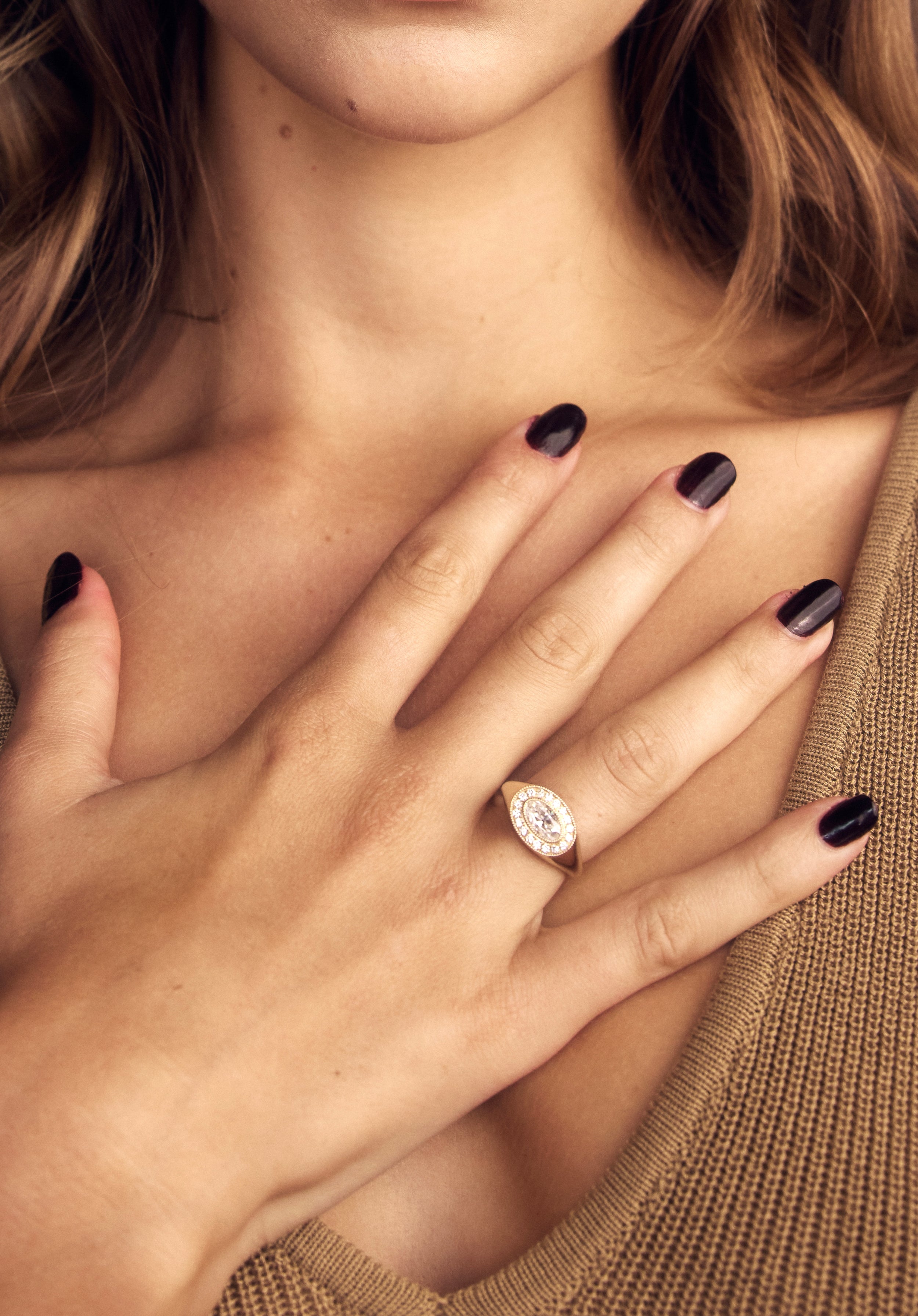 Combining a bold, modern silhouette with antique accents, this gypsy set oval signet is the dreamiest, most understated style. A sparkling pave halo and milgrain detailing add to this ring's charm. This super comfortable style can be worn as a cool-girl engagement ring or the ultimate power-pointer.