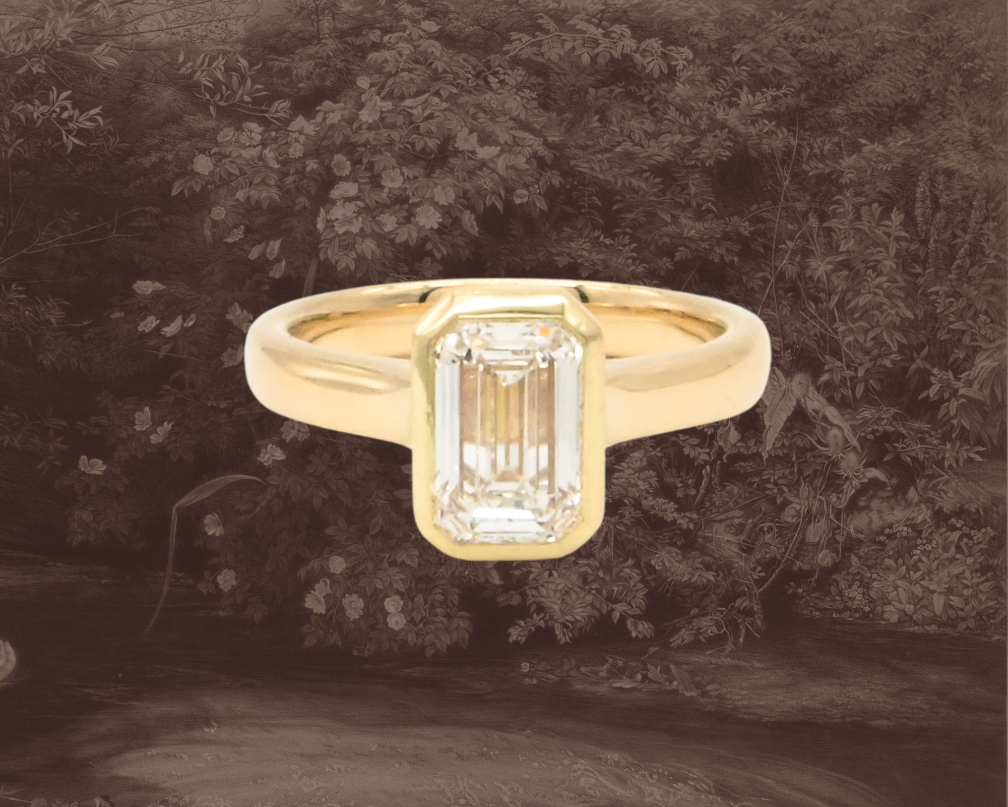 Meet our extraordinary bezel set 1.93ct emerald cut lab diamond engagement ring. Featuring a cathedral band and square profile shank, she's a modern classic.