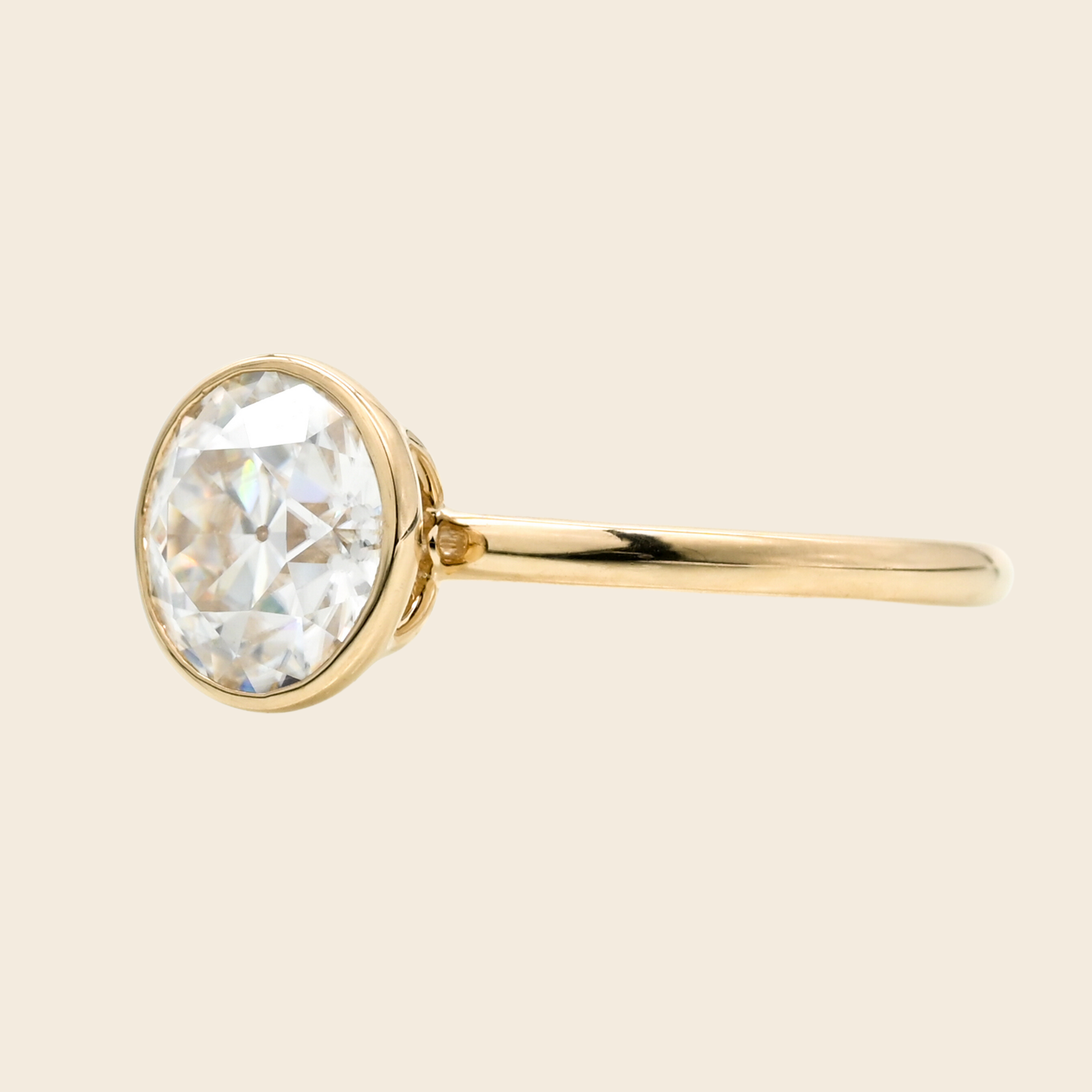 Meet our Old European Cut bezel solitaire moissanite engagement ring.