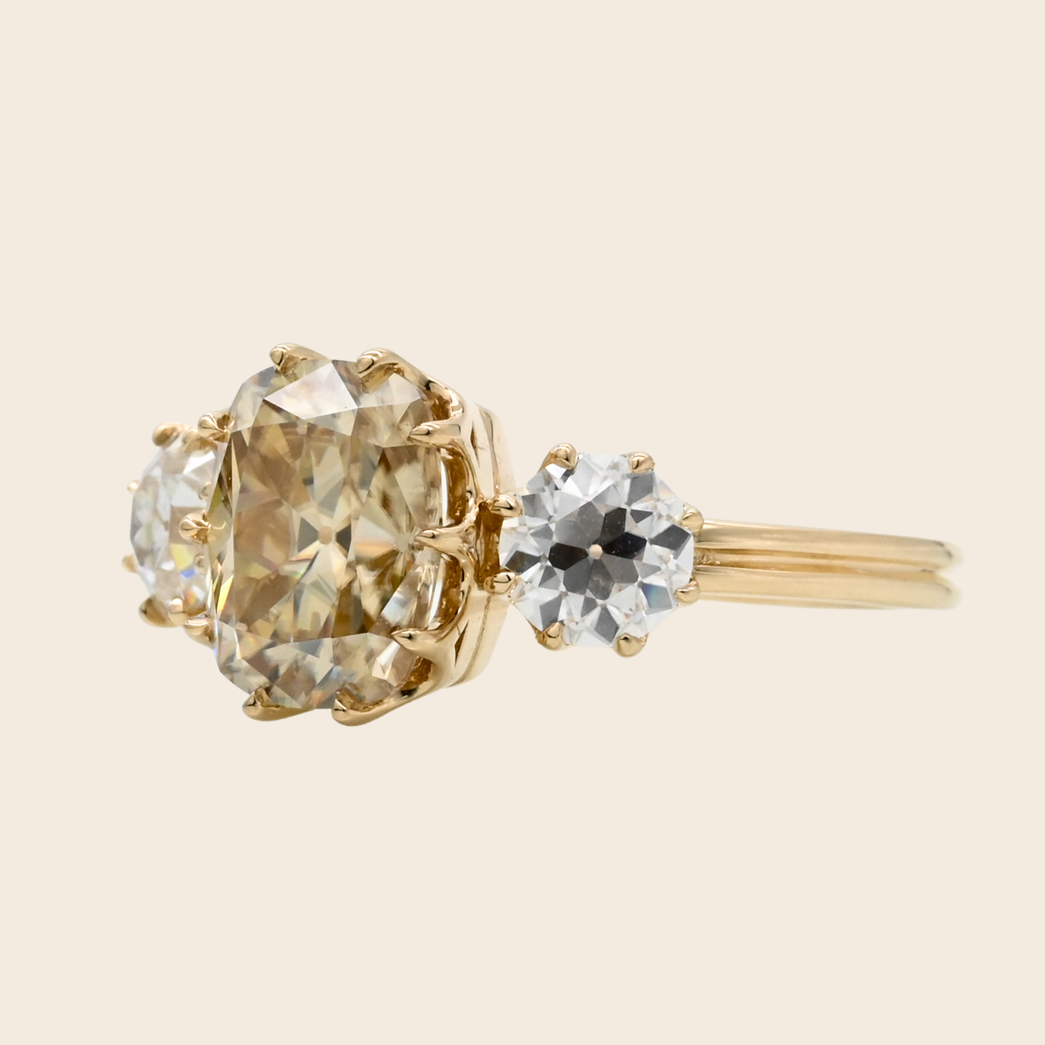 Meet our champagne old mine cut three-stone moissanite engagement ring.