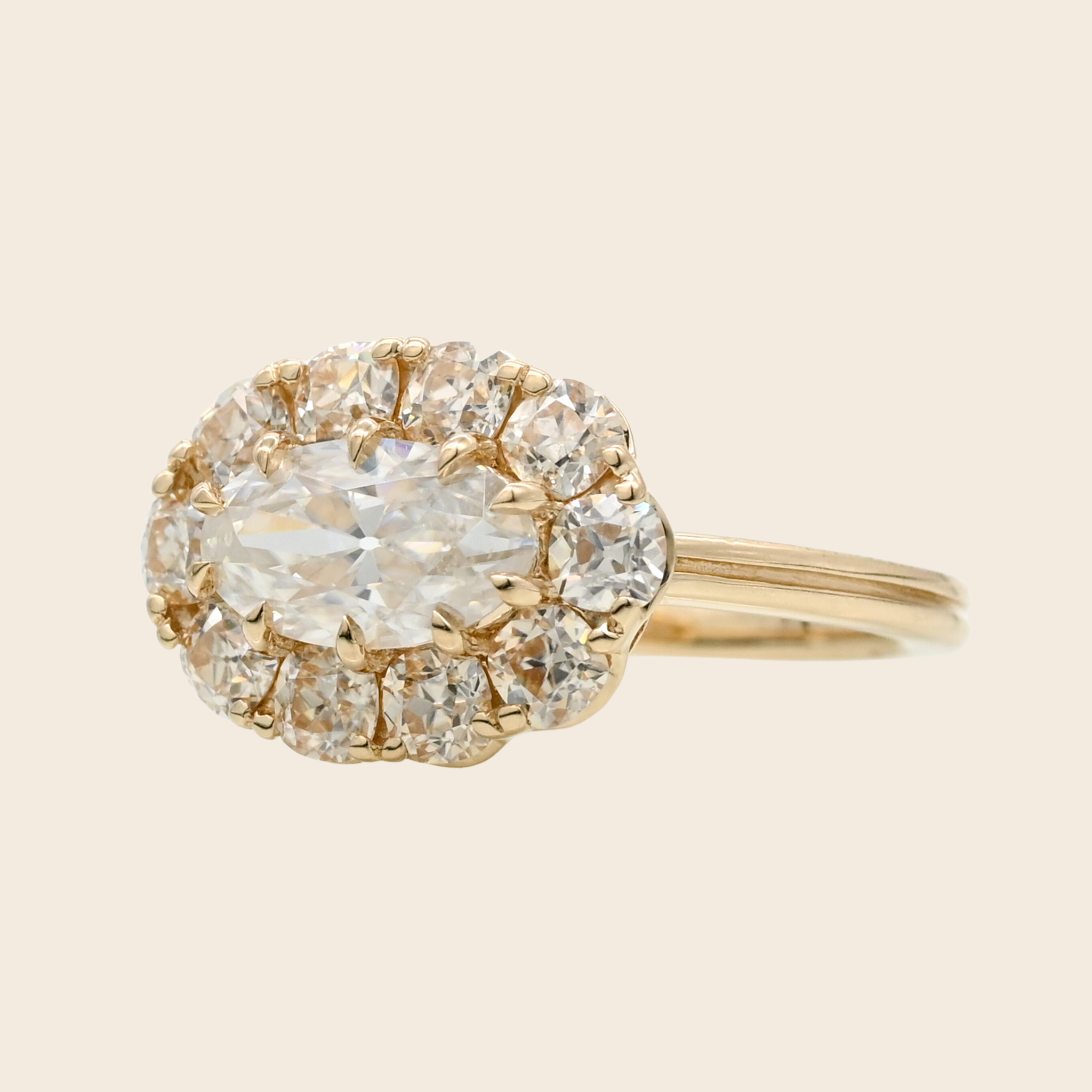 The Zimmer cluster features a plush, old-cut oval centre stone, surrounded by a dazzling old mine cut halo.